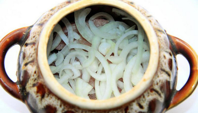 Voeg zout en kruiden toe, voeg water toe. Dek de potten af met folie en plaats ze 1 uur in een voorverwarmde oven op 180 graden.