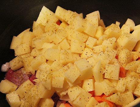 - Schil de aardappelen, was en snij in grote blokjes. Leg de aardappelen op het vlees.
