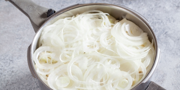 - Snijd de ui in halve ringen, leg deze op het vlees. Doe een eetlepel zure room op de uienlaag.
