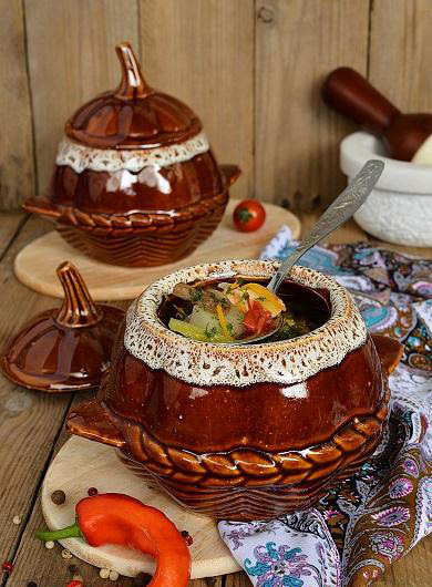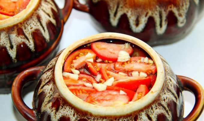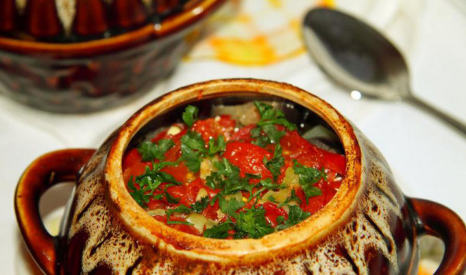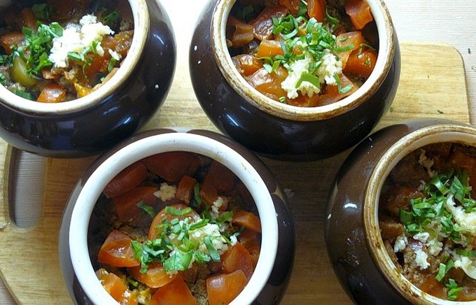 - Breng op smaak met zout en kruiden. Giet in water of bouillon. Bak de canakhi 90 minuten in de oven op 180 graden. Voeg vervolgens een beetje gehakte knoflook en gehakte kruiden toe aan elke pot en zet de schaal nog 10 minuten in de oven.