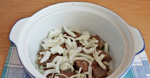 - Pel de ui en snijd hem in halve ringen. Breng de ui over naar het vlees, zout en breng op smaak.