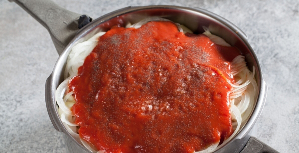 - Voeg tomatensaus en kruiden toe aan de ketel, roer en laat de canakhi nog 1 uur sudderen.
