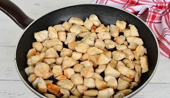 - Snijd vervolgens de kipfilet, bak deze in plantaardige olie en doe deze ook in potten.
