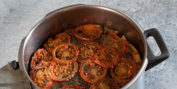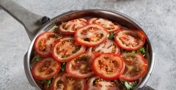 - Was de greens en hak ze fijn met een mes. Snijd de tomaten in dunne plakjes. Laag een laag groen, dan een laag tomaten.