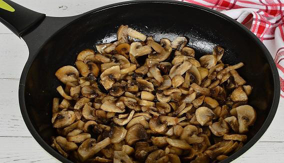 - Snijd de champignons in plakjes, bak ze in plantaardige olie. Leg de champignons op de tomatenlaag.