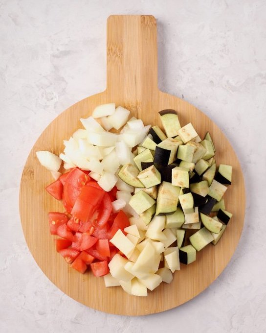 - Schil de aardappelen, was en snijd ze in middelgrote partjes. Snijd de aubergines in plakjes, de ui in halve ringen.