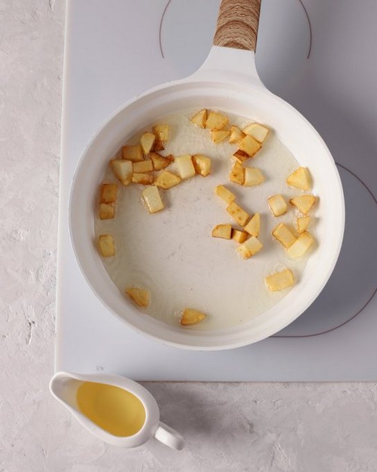 - Schil de aardappelen, was ze, snijd ze in blokjes en bak ze 2-3 minuten in plantaardige olie.