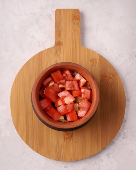 - Schil de aubergines, snijd ze in blokjes en doe ze in een kom. Haal de knoflook door een pers, voeg deze toe aan de andere ingrediënten. Doe de tomaten in hun eigen sap, giet er een beetje water bij.
