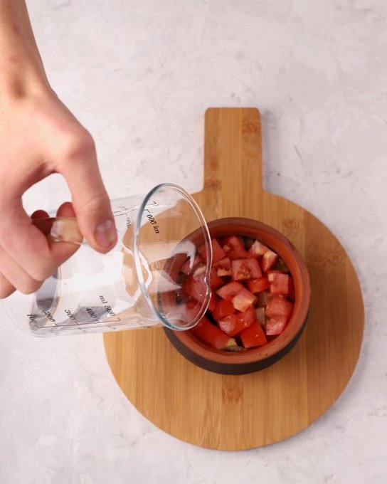 - Giet tomatensap in een pan, zout en breng op smaak.