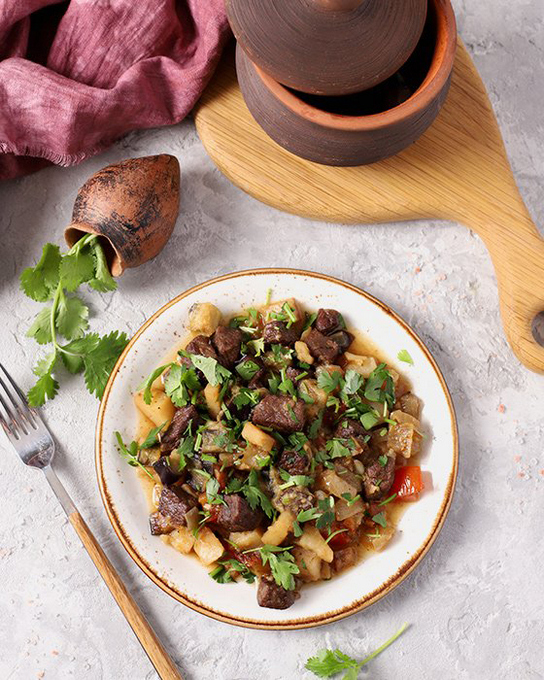 Geurig gebraden vlees in Georgische stijl. Chanakhi wordt traditioneel gekookt in aarden potten van lams- of rundvlees. We raden je aan een andere versie van dit oosterse gerecht met varkensvlees te proberen.