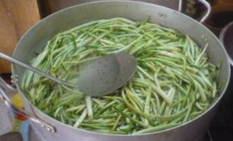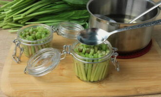 Kook de wilde knoflook 3-5 minuten, verwijder met een schuimspaan (dit is de handigste manier). We gieten het in ijswater. We verwijderen water met een vergiet. Wanneer het water volledig is afgetapt, brengen we het over in een pot en vullen het met kokende pekel.