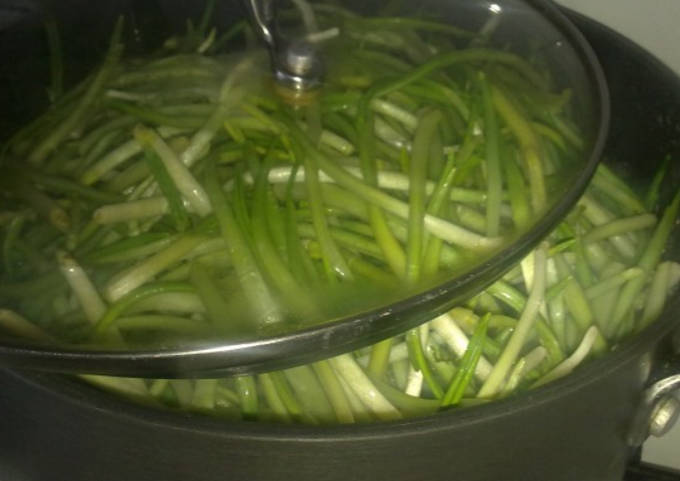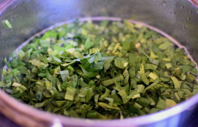 - De pan met daslook laten we in de keuken staan. We controleren constant het zouten en verwijderen het schuim. Anders zal het verslechteren.
