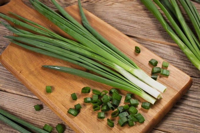 - We wassen ook de bos uien en drogen ze af met een papieren handdoek, in stukjes gesneden.
