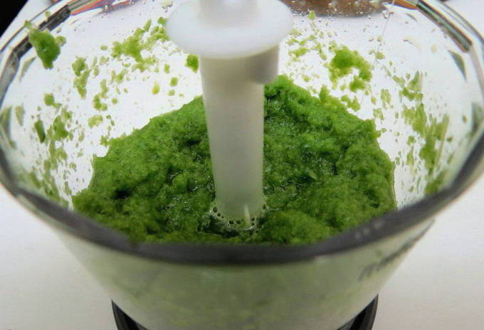 - We brengen alle ingrediënten over naar de blenderkom. Giet olie in en maal tot een enkele massa.
