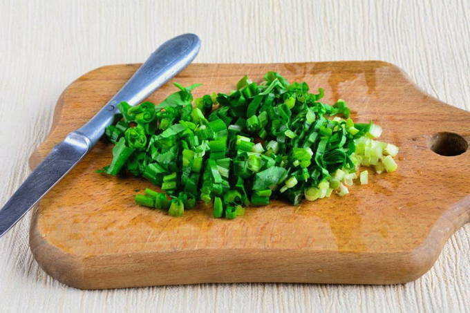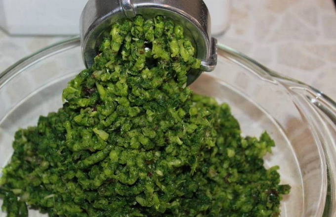 - We sorteren daslook, verwijderen droge of beschadigde bladeren en stengels. We wassen de daslook en drogen de overtollige vloeistof af met een papieren handdoek. Hak fijn (je kunt malen met een vleesmolen of blender).