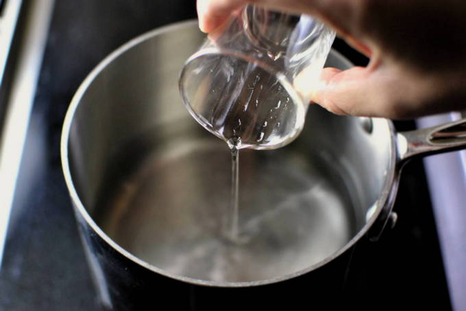 Als het water kookt, voeg je er azijn aan toe. Giet de wilde knoflook eruit.