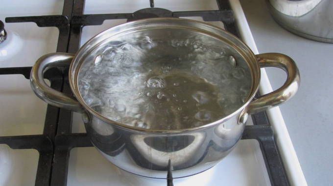 - Bereid een zoutoplossing in een aparte container. Giet water in een pan en voeg zout toe. We zetten de kachel aan. Breng water en zout aan de kook. Filtreer de oplossing door kaasdoek.