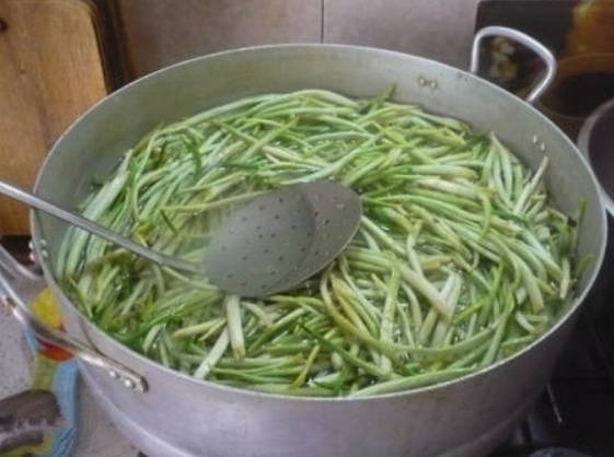 Als het water kookt, voeg je er azijn aan toe. Giet de wilde knoflook eruit.