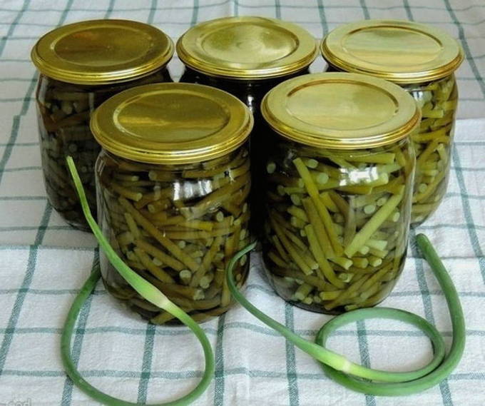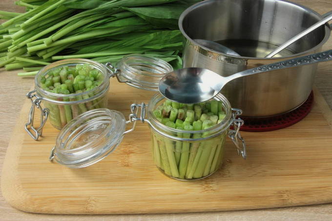 Kook de wilde knoflook 3-5 minuten, verwijder met een schuimspaan (dit is de handigste manier). We gieten het in ijswater. We verwijderen water met een vergiet. Wanneer het water volledig is afgetapt, brengen we het over in een pot en vullen het met kokende pekel.