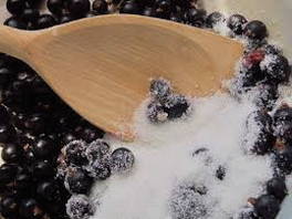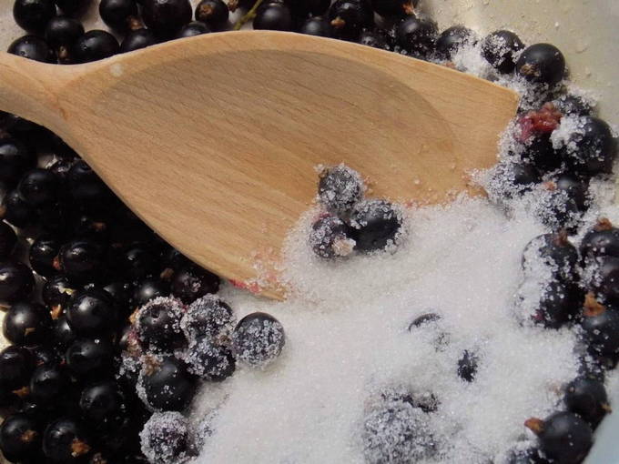 - Giet suiker over de gedraaide bessen en roer. Laat een half uur staan zodat het krentensap de suiker oplost, nogmaals goed mengen