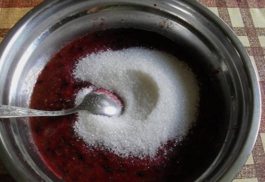 - Voeg suiker toe aan de bessenpuree, roer en laat 15 minuten staan om de suikerkorrels op te lossen.