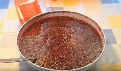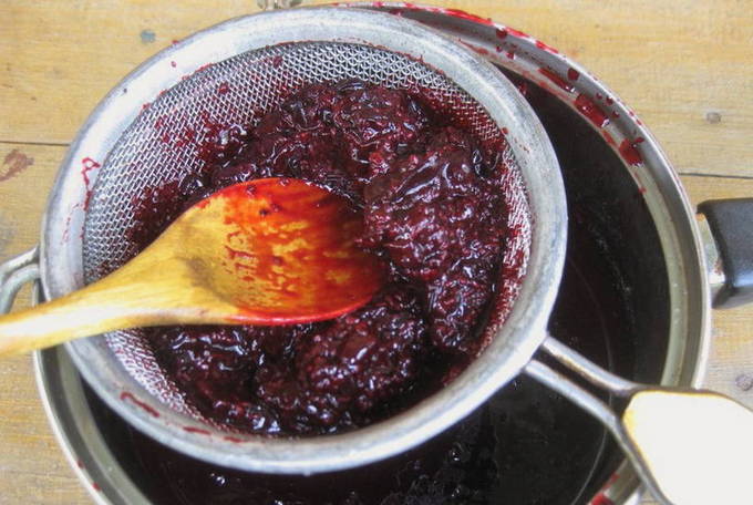 - Wrijf de resulterende massa door een zeef om een dik sap te maken.