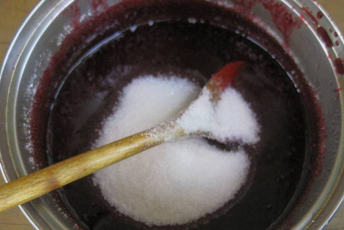 - Voeg suiker toe aan het bessensap. Het is het beste om dit in kleine porties te doen en meteen te roeren met een niet-metalen lepel. Wacht tot de suiker is opgelost en de massa begint in te dikken. Dit duurt ongeveer een uur.