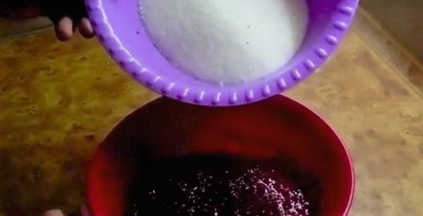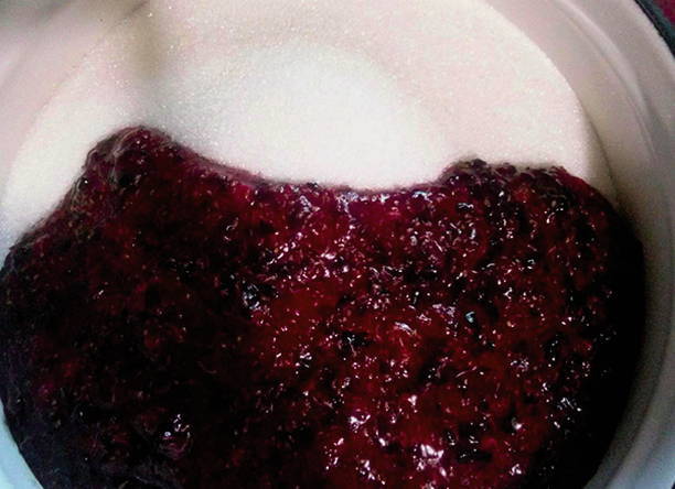 - Voeg suiker toe aan de bessenmassa, roer en laat enkele uren in de koelkast staan. Roer de bessenmassa om de 30-40 minuten om de suiker volledig op te lossen.