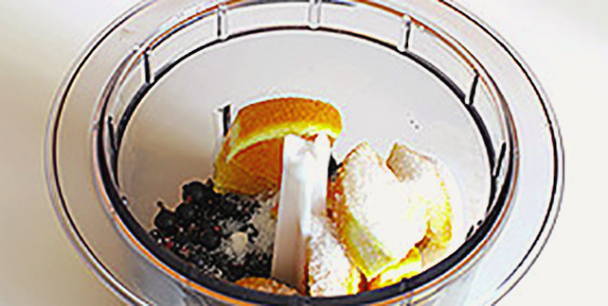 - Maal het tweede deel van de bessen samen met suiker en sinaasappelschijfjes in een blender.