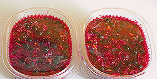 - Meng daarna de bessenmassa met de gelatineuze massa, meng goed.