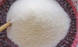 Vul de voorbereide bessen met suiker, laat ongeveer de helft achter en maal ze met een lepel of een ander voorwerp.