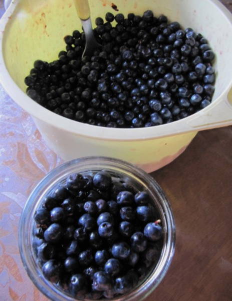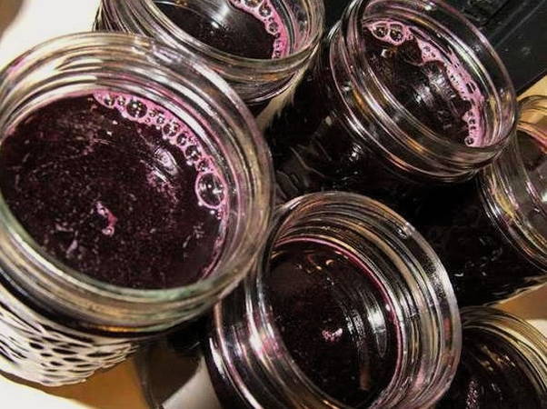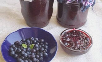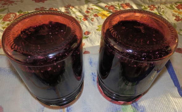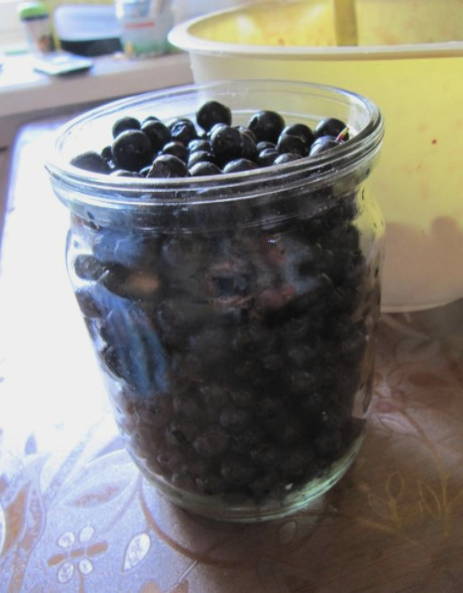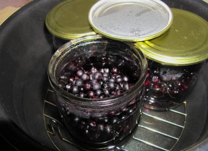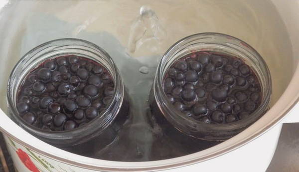 Gedurende deze tijd steriliseren we de potten om ze meteen te vullen met gekoelde blauwe bessen in ons eigen sap. We rollen de potten op met voorbereide deksels en sturen ze op voor opslag.