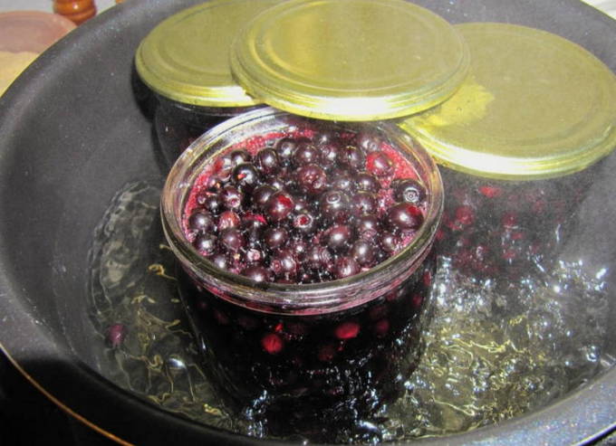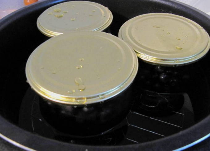- Doe bosbessen in gesteriliseerde potten en dek af met een deksel, zonder het strak te draaien. We zetten de potten in een pan met koud water en brengen ze aan de kook. In dit stadium beginnen de bosbessen sap te produceren. Wij verwijderen de dekens.