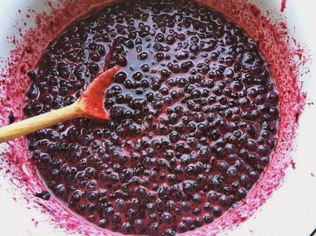 - Dit doen we totdat de blauwe bessen helemaal in hun eigen sap zijn en niet meer krimpen.