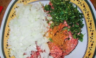 - Laten we de vulling voorbereiden. Meng hiervoor ontdooid gehakt, zout, kruiden en fijngehakte uien.