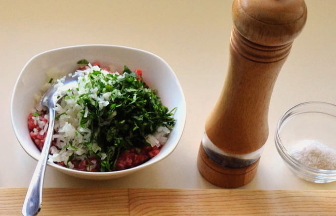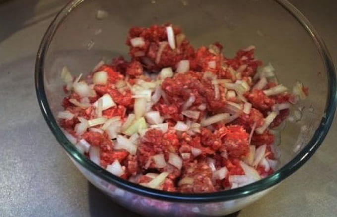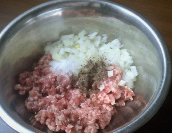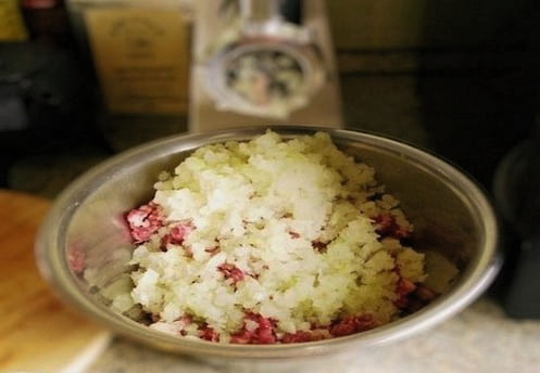 - Roer voor de vulling het gehakt om met zout en zwarte peper. Voeg hieraan fijngesnipperde uien toe.