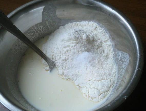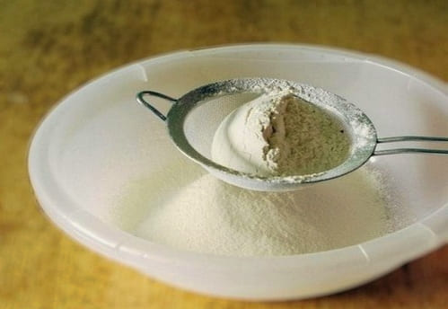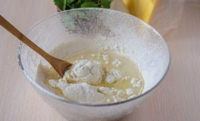 - Zeef hier bloem en voeg zout toe. We beginnen de massa te roeren.