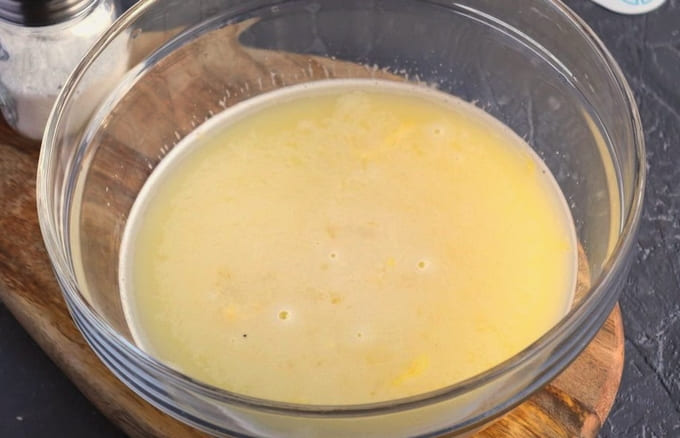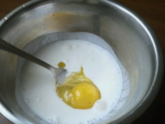 - Giet kefir in een diepe kom en breek hier een kippenei. Roer tot een gladde massa.
