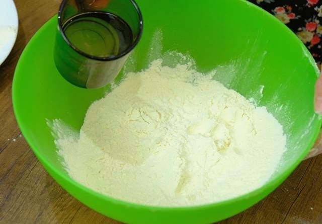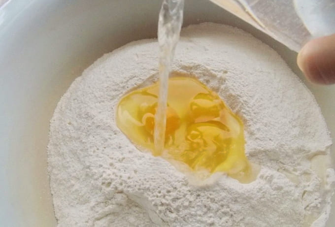 - Zeef de bloem en doe deze in een groot diep bord. Giet kokend water over het droge ingrediënt en begin te roeren.