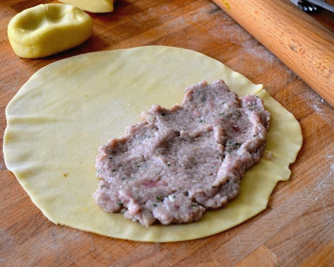 - Verdeel het deeg in kleine stukjes en rol ze in dunne cirkels. Leg op elke helft een beetje gehakt en lijm de randen vast.