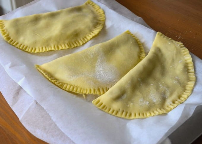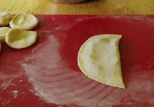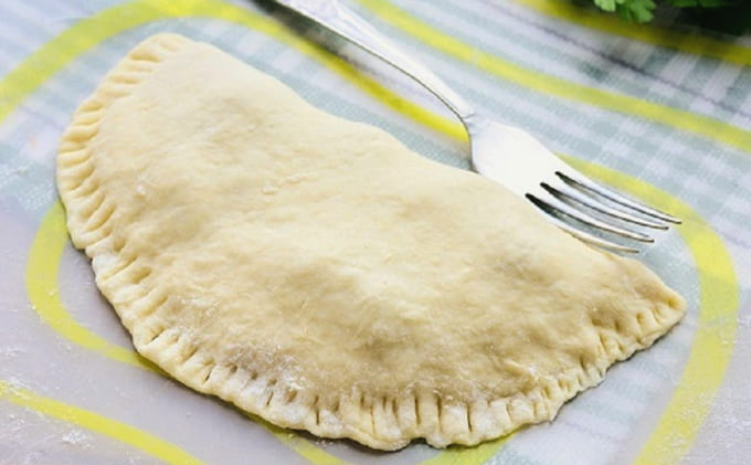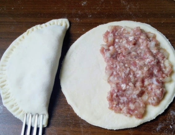 Verdeel het deeg in kleine stukjes. Rol ze dun uit tot cirkels, vul ze met vulling en vouw ze dubbel. We fixeren de randen met een vork.
