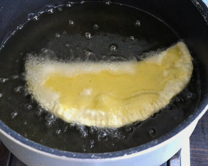 - Bak de pasteitjes in kokende plantaardige olie tot een heldere gouden tint verschijnt.