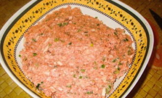 - Laten we de vulling voorbereiden. Gehakt kan kant-en-klaar worden gebruikt of zelfstandig in een vleesmolen worden gerold. We voegen er ook gesnipperde uien, zout en peper aan toe. Roeren.