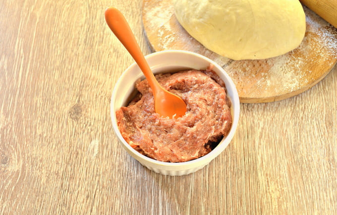 - Op dit moment zullen we de vleesvulling bereiden. Roer het ontdooide gehakt met zout en fijngehakte uien.