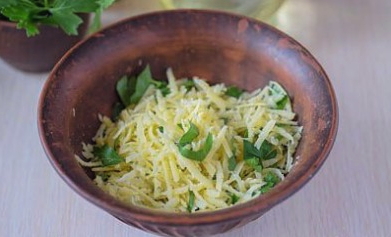 - Terwijl het deeg rust, kun je de vulling maken. Rasp hiervoor harde kaas op een grove rasp en hak de kruiden fijn. Roer voedsel met zout in een diepe kom.