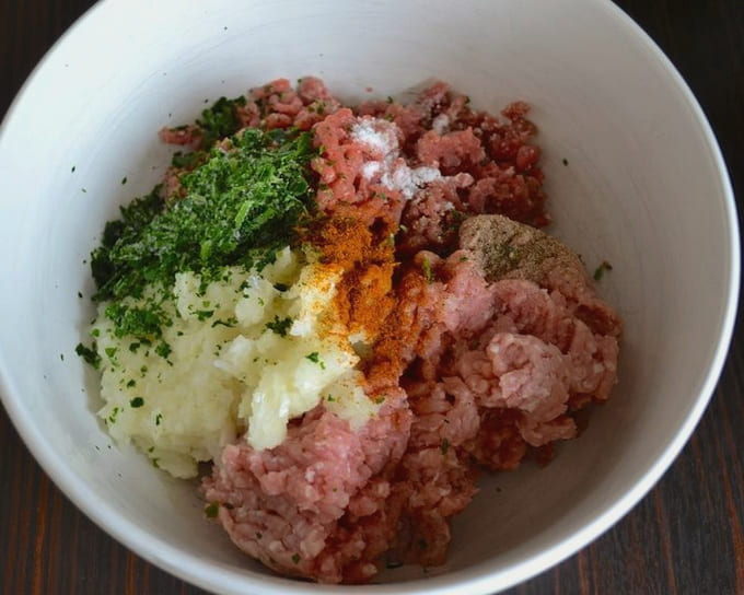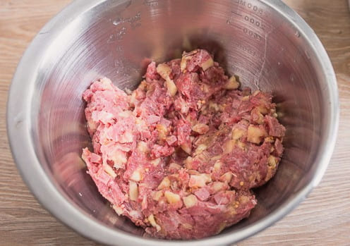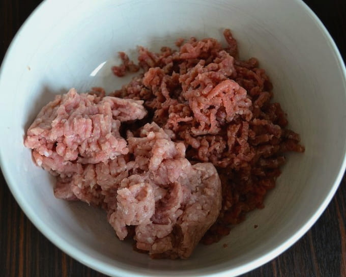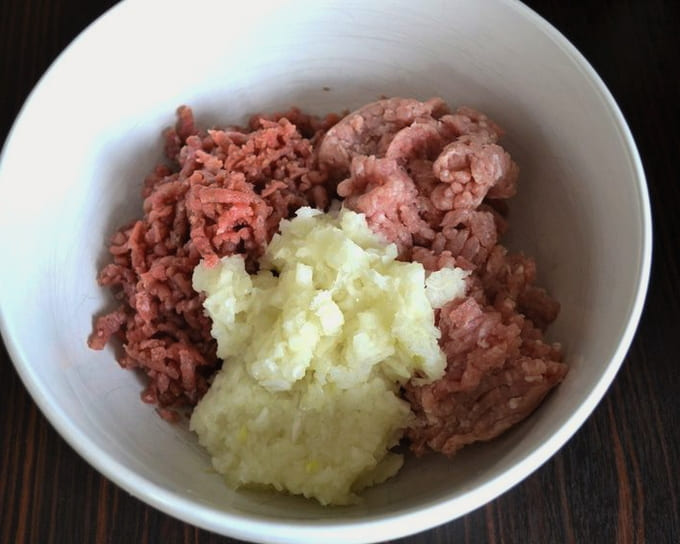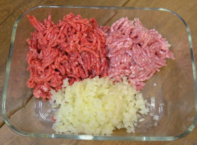 - Combineer varkensvlees en rundergehakt in een aparte kom, voeg er gehakte uien aan toe.