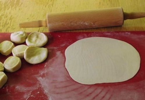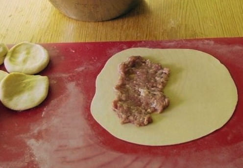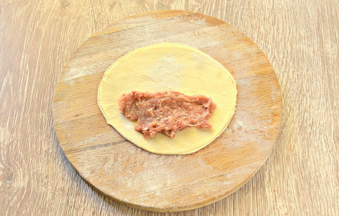 - Verdeel het deeg in kleine stukjes, die elk tot een dunne, gladde cirkel worden gerold. Leg een beetje vleesvulling op de helft van de cirkel.