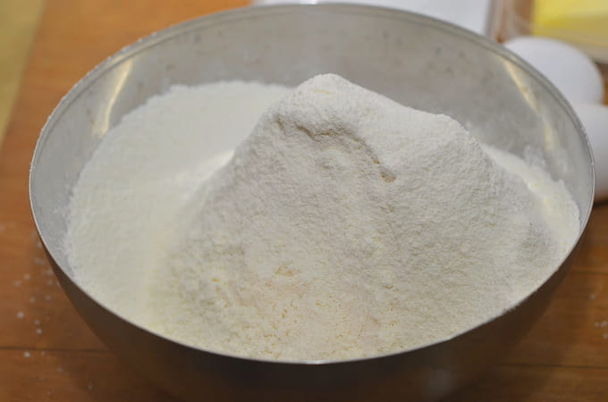 - Laten we beginnen met het bereiden van een dicht en elastisch deeg. Zeef vier kopjes bloem grondig.
