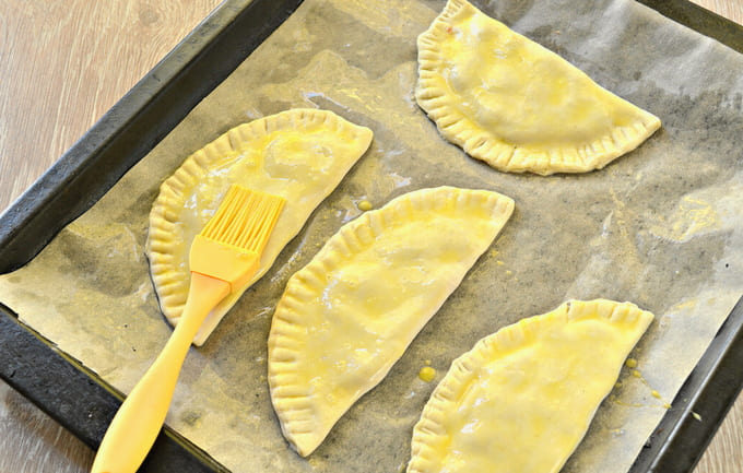 - We verspreiden de pasteitjes op een bakplaat bedekt met perkament. Klop het resterende ei los en bedek het rauwe product ermee. Het is handig om hiervoor een siliconenborstel te gebruiken.