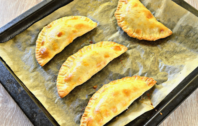 - Klassieke pasteitjes zoals in chebureks van de USSR met gehakt, gebakken in de oven